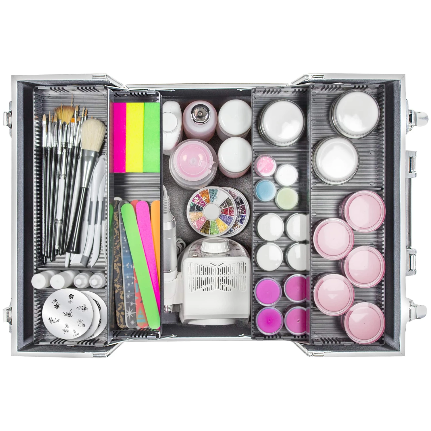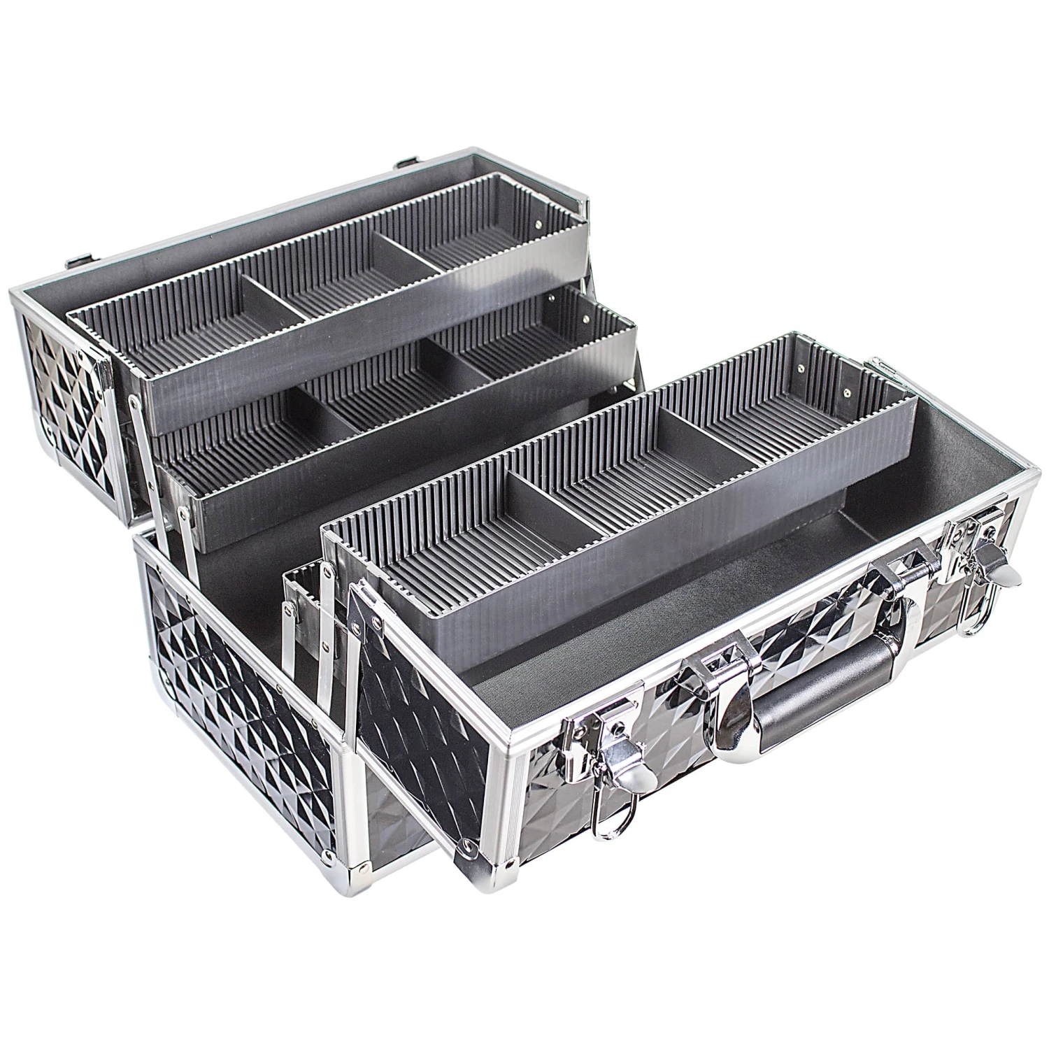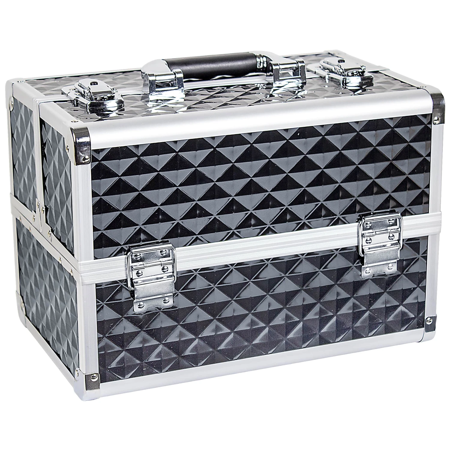Der Beauty Koffer DIAMOND Aluminium schwarz ist der perfekte Kosmetikkoffer. Er eignet sich ideal für den Transport und die Aufbewahrung von Nageldesign-, Fußpflege-, Friseur-, Schmink- & Kosmetik-Zubehör. Der Kosmetikkoffer bietet ein seitlich aufklappbares Oberfach mit 2 Ausziehfächern, die jeweils nochmal unterteilt sind sowie ein großes Fach in der Mitte. Dadurch ist er perfekt für eine geordnete Aufbewahrung Ihres Zubehörs geeignet. Die Stoßkanten des Koffers sind verstärkt, dadurch ist er extrem belastbar und schützt Ihre Beauty Werkzeuge. Das integrierte Schloss bietet zusätzliche Sicherheit beim Transportieren und Aufbewahren. Maße im geschlossenen Zustand: L 35cm x B 22,5cm x H 25cm.