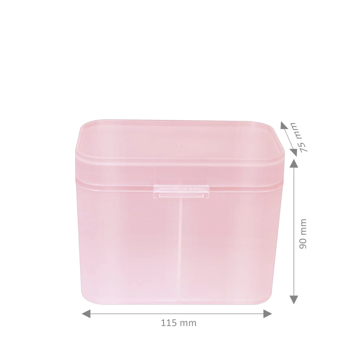 Unsere Aufbewahrungsbox für Clean Pads bringt platzsparend Ordnung auf deinen Nageltisch. Die Box beherbergt zwei einzelne Fächer, die perfekt für diesen Zweck geeignet sind. Der Klappdeckel schützt vor Staub und Verschmutzung. Und das nicht nur im Nagelstudio, sondern auch zuhause und unterwegs. Der milchig transparente Kunststoff, ist nicht nur strapazierfähig und leicht zu reinigen, sondern Du behältst auch Einblick und Übersicht in die Box von aussen. Maße – Total: BxHxT 11,5 x 7 x 9cm – Fach: 5,5 x 7 x 6,5cm