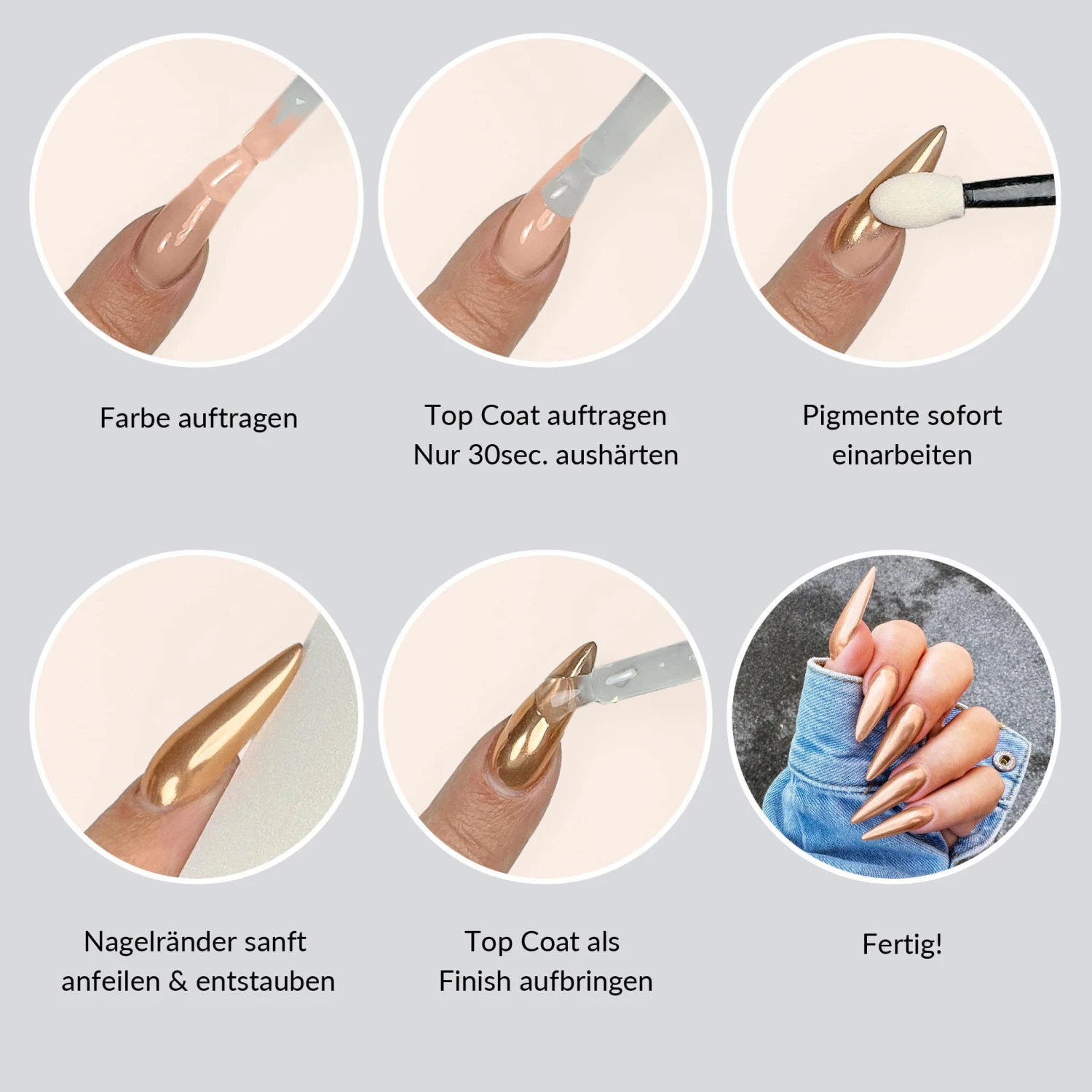 Die weichen Pastelltöne lassen sich auf vielseitige Weise anwenden: Du kannst sie in die Schwitzschicht einarbeiten, mit Gel vermischen oder mit einem Pigmentpinsel auftragen, um atemberaubende Highlights oder komplette Nageldesigns zu kreieren. Ob für Akzente oder großflächige Looks – die Möglichkeiten sind grenzenlos.