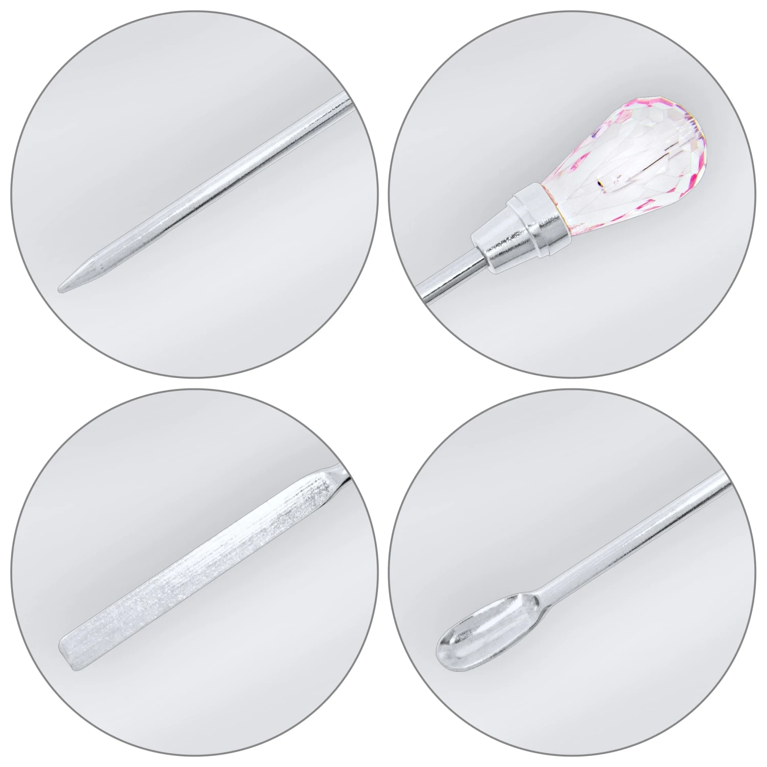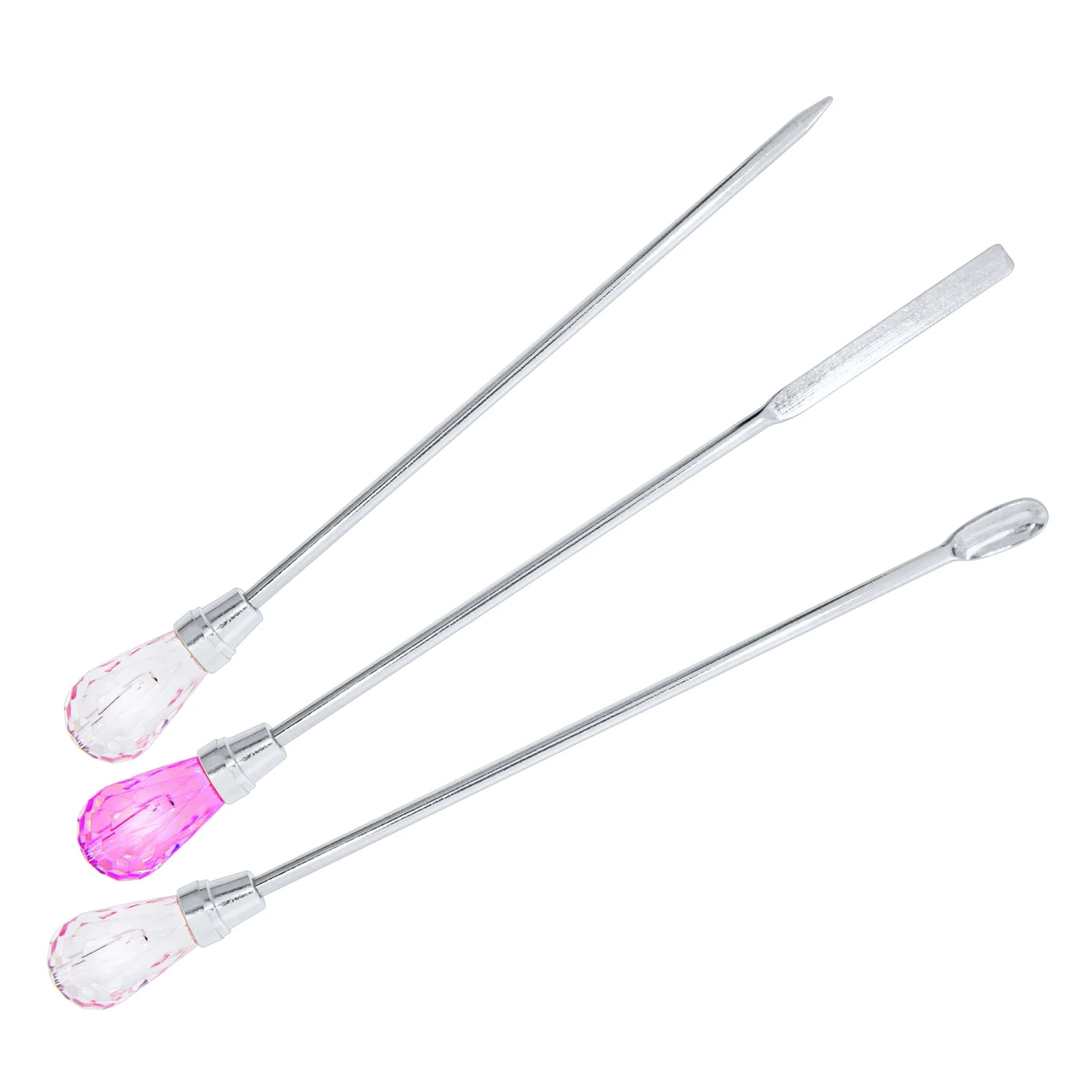 Das Diamond Allround Tool Set ist das perfekte Set für alle Nageldesign-Anwendungen. Es enthält drei hochwertige Werkzeuge: einen Diamant Löffel, einen Spatel und einen Stick. Der Diamant Löffel ist nicht nur ein praktischer Helfer, sondern auch ein Blickfang in Ihrem Nagelstudio. Mit ihm können Sie Acrylpulver, Glitzerpuder, Nailart, Gel und Co. perfekt dosieren, umfüllen oder umrühren. Der wunderschön schillernde, diamantförmige Schmuckstein verleiht dem Löffel eine edle und glamouröse Note. Der Spatel ist ebenfalls mit einem Schmuckstein verziert und eignet sich perfekt zum Umrühren von Gele und zum Aufnehmen von Nailart wie Puder und Glitter. Der Stick ist ein praktisches Werkzeug zum Umrühren und anmischen.