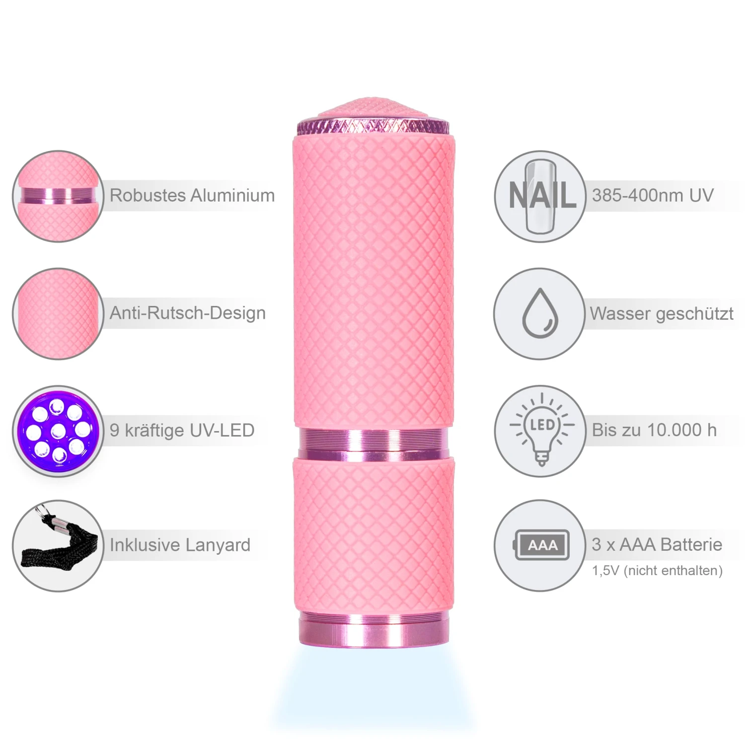 Dieses Produkt kann die Leistung einer 12W LED Lampe erreichen. Perfekt zum einfachen schnellen fixieren, ausbessern und reparieren. Bei starkpigmentierten Gelen oder Lacken kann es zu lückenhaften Aushärtungsergebnissen kommen.Ein 3 x AAA-Batterienfach (nicht enthalten). - Tragbarkeit