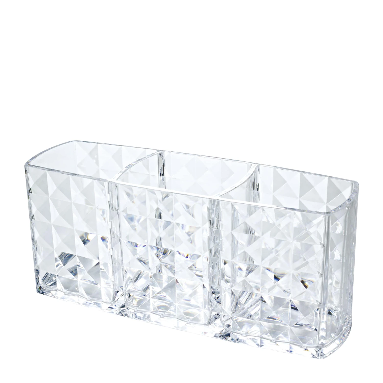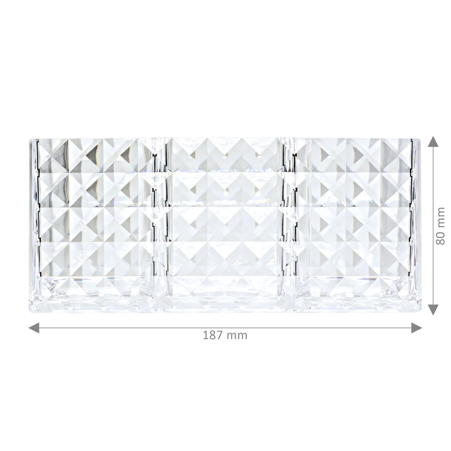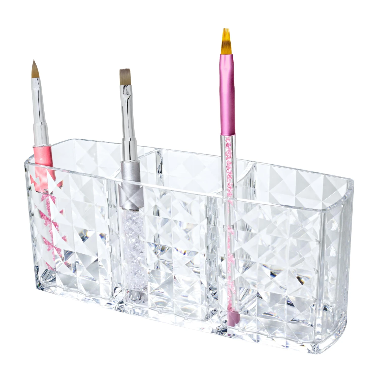 Dieser Organizer ist für alle Nageldesign Tools, wie etwa Pinsel, Feilen usw. geeignet und hält ihre wichtigsten Arbeitsinstrumente stets für Sie bereit. Der schöne Ordnungshelfer im Diamondoptik passt hervorragend auf den Nageltisch und ist zudem ein eleganter Blickfang. Ihre Naildesign Werkzeuge können in drei geräumigen Fächern abgelegt werden, so haben Sie sie stets griffbereit und perfekt geordnet zur Hand. Der schöne Organizer ist auch perfekt für Make-Up Pinseln oder Kosmetik geeignet und sieht dazu sehr elegant aus ob im Bad oder auf ihrem Schminktisch.