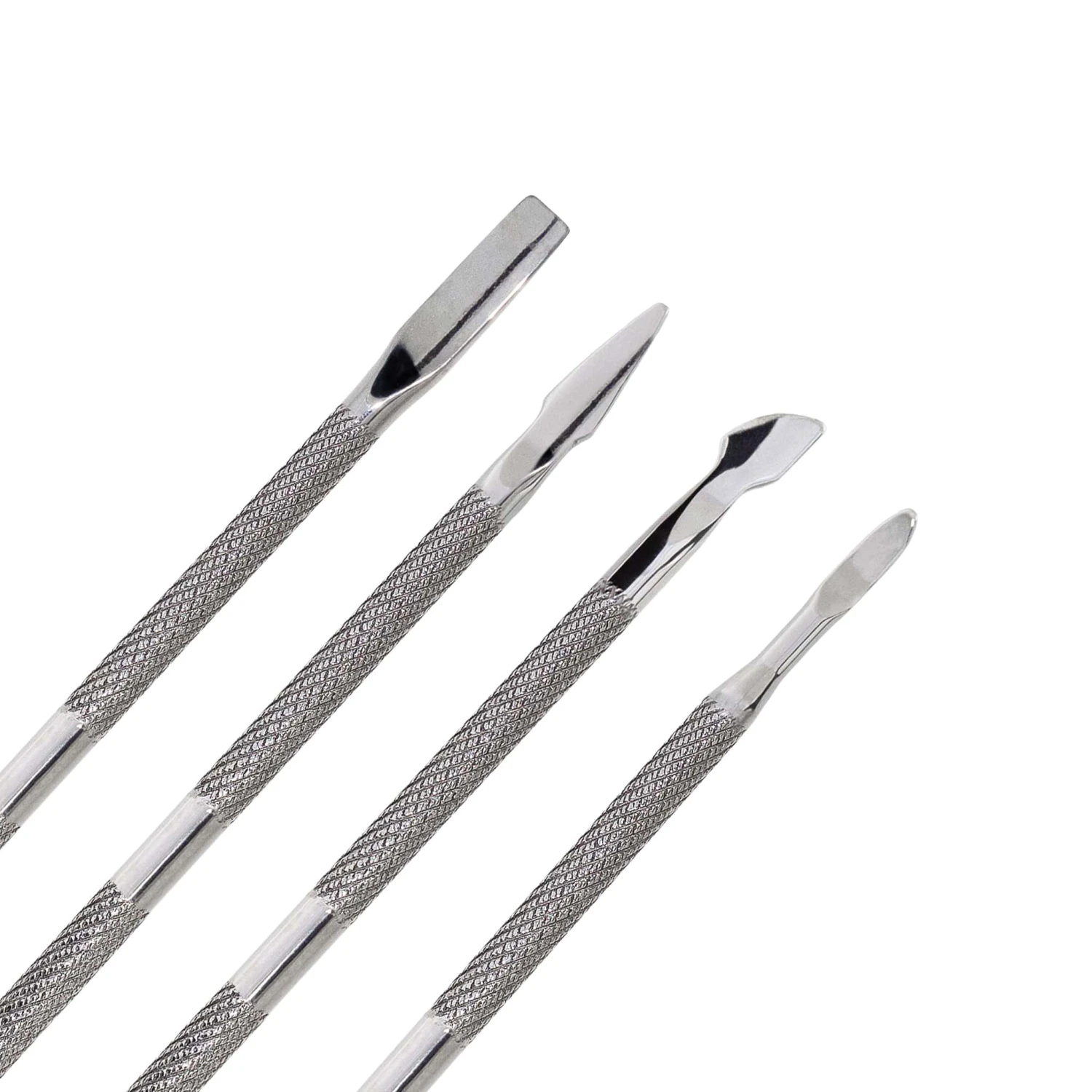 Das Nail Tool Set Maniküre & Pediküre 4-teilg besteht aus vier unterschiedlich geformten Tools, die zum Entfernen der Nagelhaut oder zum Säubern der Nagelränder benutzt werden können: