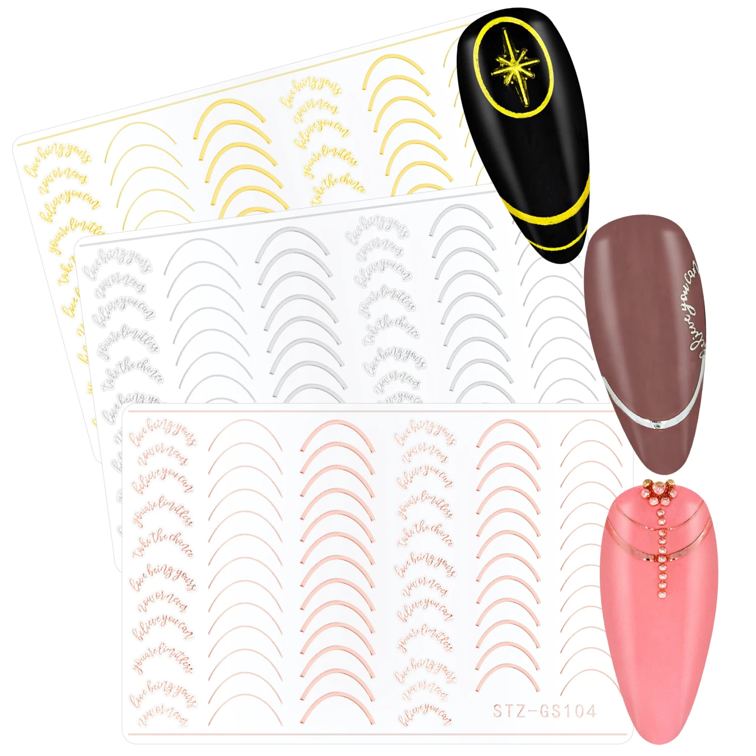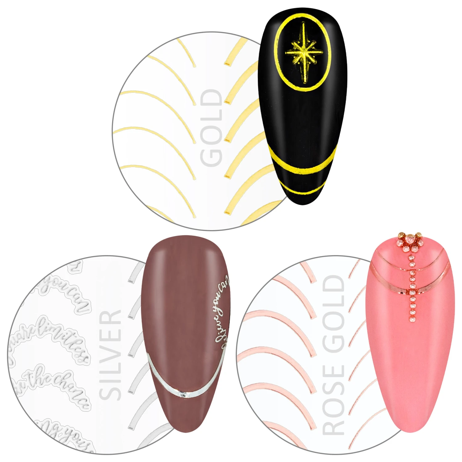Dieses French Line Sticker Set verleiht deinen Nägeln minimalistische Akzente. Mit dem Set erhälst du 3 Bögen in den Farben gold, rose gold und silver.