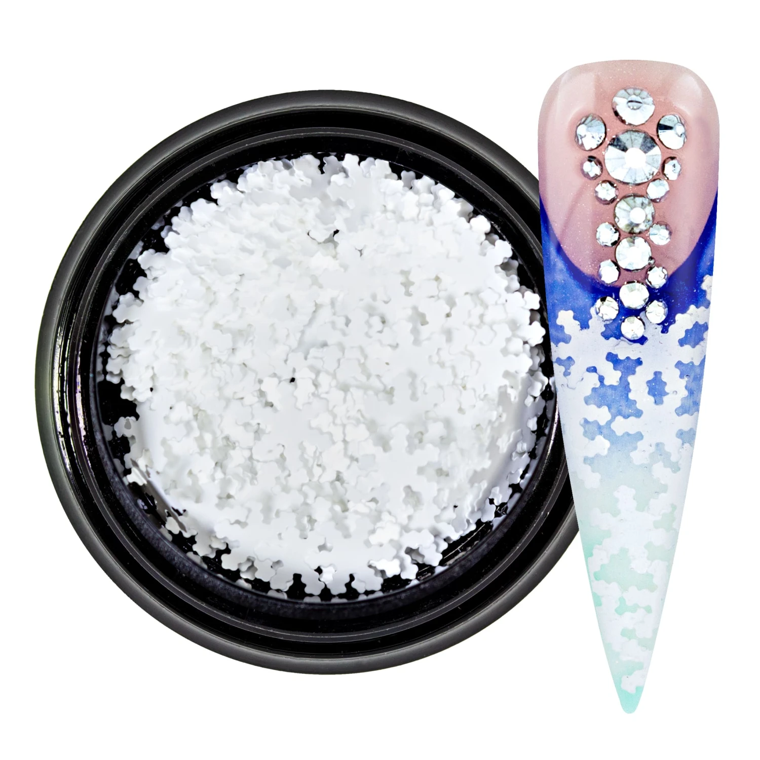 Nailart Inlay Snowflake bringen neben highlight Effekten auch frostige Schneeflocken auf Ihre Fingernägel. Feine Glitterpartikel, weißen Snowflakes, lassen Ihre Nägel winterlich glitzern. Das Richtige für tolle Winterdesigns.