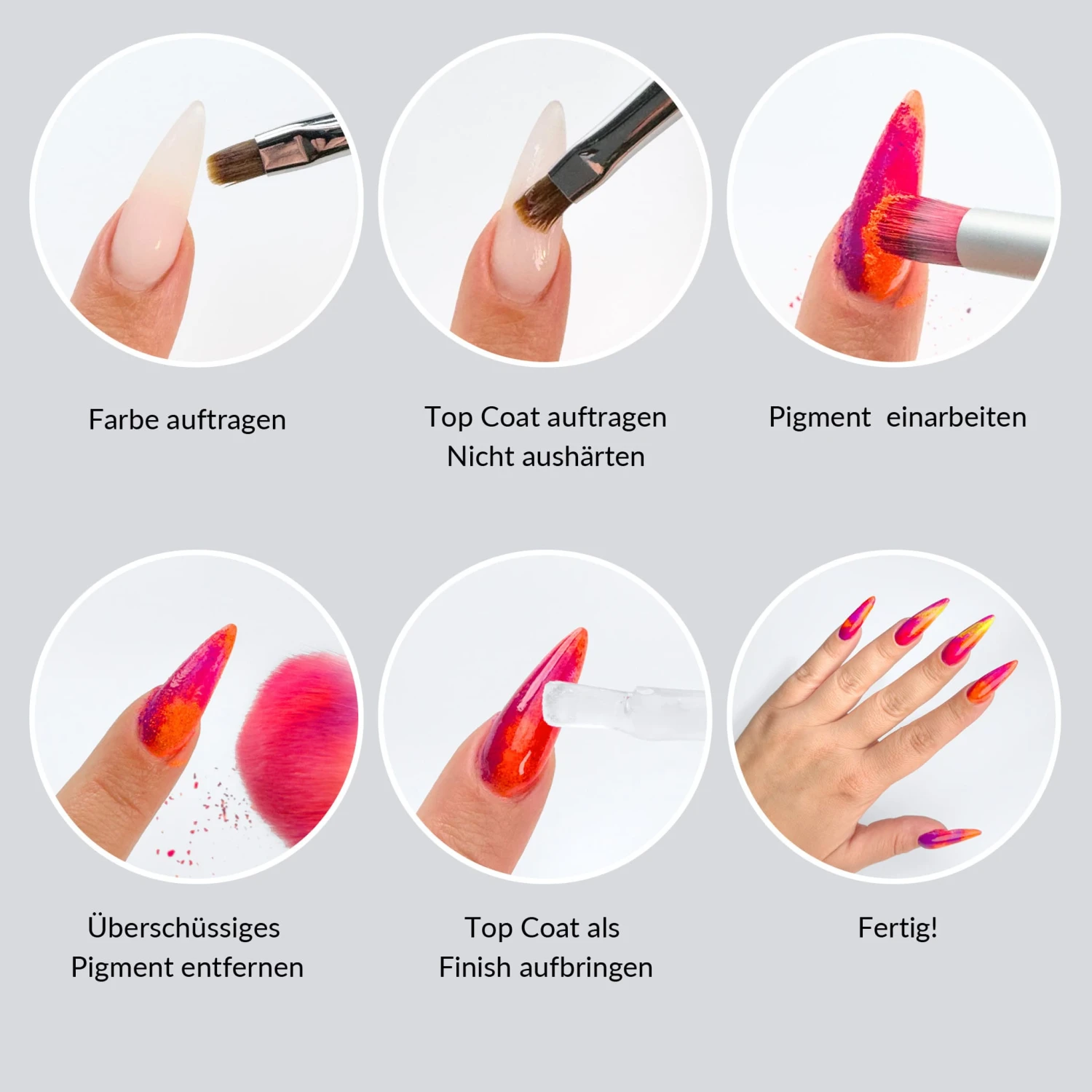 Die Pigmente lassen sich auf verschiedene Weise anwenden: Du kannst sie in die Schwitzschicht einarbeiten, mit Gel mischen oder mit einem Pigmentpinsel auftragen. Egal, ob du farbenfrohe Akzente setzen oder einen kompletten Neon-Look kreieren möchtest – das Neon Pop Powder bietet dir maximale Flexibilität, um deiner Kreativität freien Lauf zu lassen.