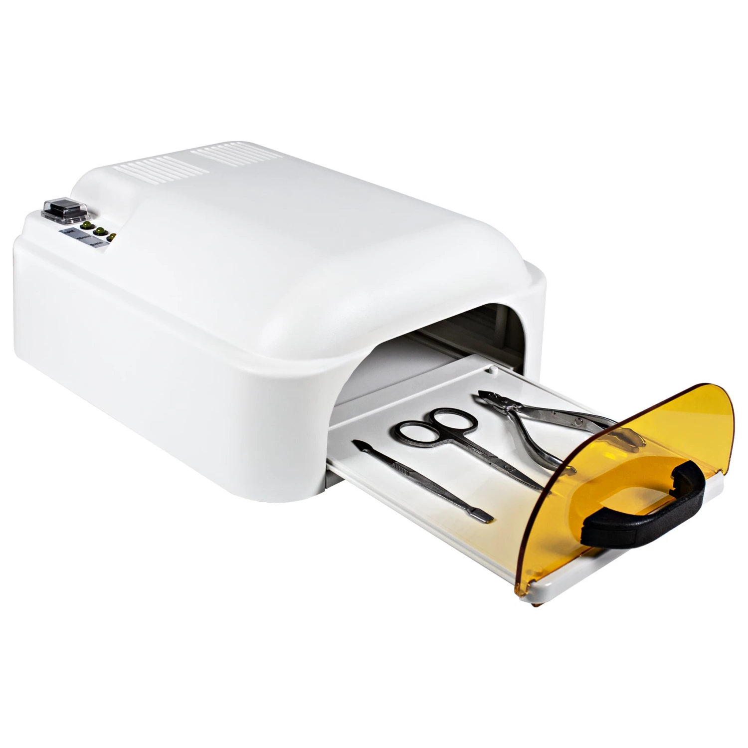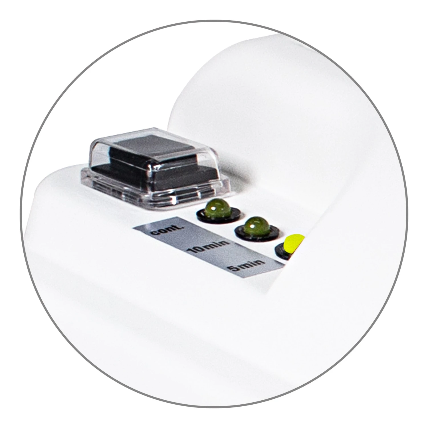 Das UVC Sterilux Sterilisator desinfinziert Arbeitsmaterialien wie Scheren, Feilen und andere Werkzeuge der Nagelkosmetik bzw. Podologie. Hierzu werden die jeweiligen Utensilien auf den Einschub gelegt und eingeschoben. Das Gerät schaltet sich automatisch ein, durch Tastendruck kann eine Bestrahlungszeit von 5 oder 10 Minuten sowie Dauerbetrieb eingestellt werden. Der Sichtschutz verhindert den Austritt von UVC-Strahlung. Das Gerät wird inklusive 2 x UVC-Röhren mit 9 Watt geliefert. Netzspannung: 230 Volt / 50 Hz